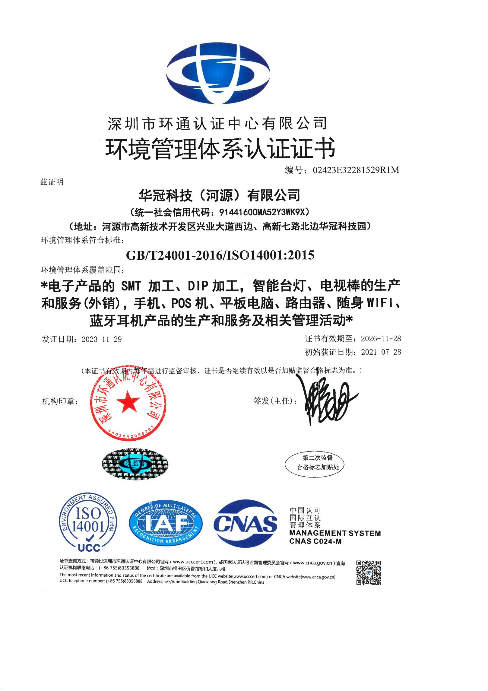 華冠ISO14001環(huán)境管理體系證書(中文)