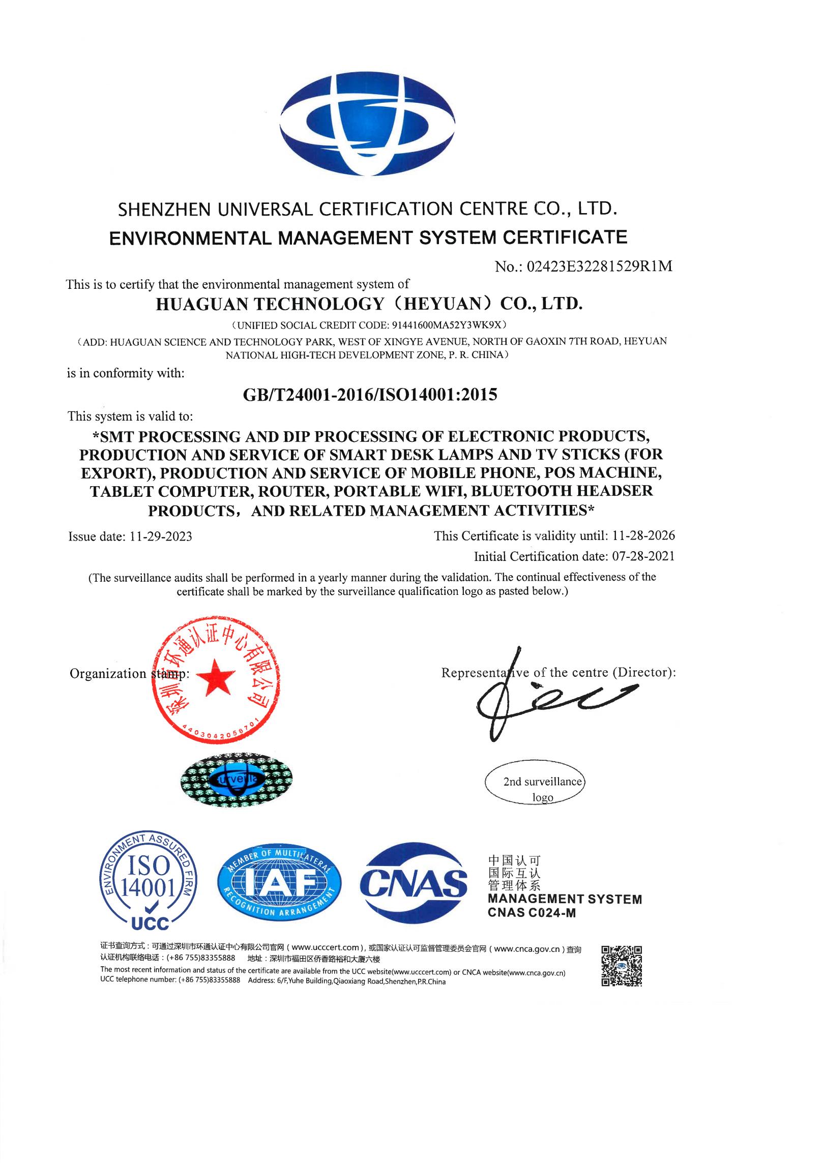 華冠ISO14001環(huán)境管理體系證書(英文)